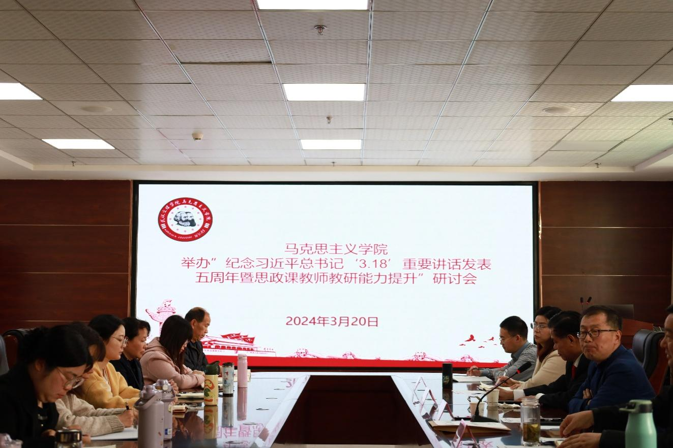 3月20日下午在行政楼912会议室,bat365中文官方网站举办了“纪念习近平总书记‘3•18’重要讲话发表五周年暨思政课教师教研能力提升”研讨会。学校党委书记杜永成,武汉理工大学教授、研究生导师李运祥,bat365中文官方网站院长毛传清、副院长曹卓以及bat365中文官方网站全体教师重温习近平总书记重要讲话精神,就学校思政课建设发展作交流。办好思政课,事关培养社会主义合格建设者和接班人,是后继有人的大事,是根本性、长远性的重大战略问题。