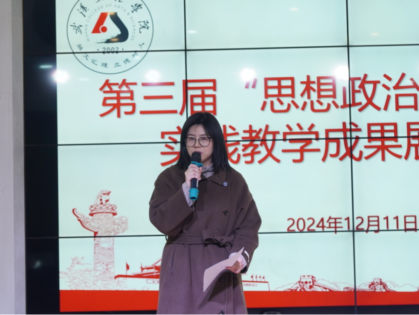 在会上,曹卓就本次实践教学展示活动作了说明。她介绍到,为全面贯彻落实教育部关于高校思政课实践教学的任务要求,推进思政课实 践教学取得成效,推动思政课高质量发展,自2022年bat365中文官方网站成立之初,5门思政主干课均被分配了实践教学学时,每门思政课的实践教学主题也被确定,逐步形成了我校思政课实践教学改革方案并实施完善,2023年开始举办我校思政课实践教学成果展示活动,现已是第三届,经过了三届的积累,学生的实践教学作品形式和内容越来越丰富,涵盖了演讲、沉浸式场馆讲解、情景剧扮演、访谈实录、社会调查报告、项目策划等多种类型,从经典著作深入经济前沿,从红色场馆来到山间地头,从世界风云回看校园家乡,丰富多样的优秀实践教学作品充分展示了新时代大学生的思想素养和精神风貌。随后,一系列实践成果亮点纷呈,让人目不暇接。这些成果以生动的形式展示了同学们在实践教学中的所学所悟,不仅深化了对思政理论的理解,更提升了实践能力和社会责任感。
